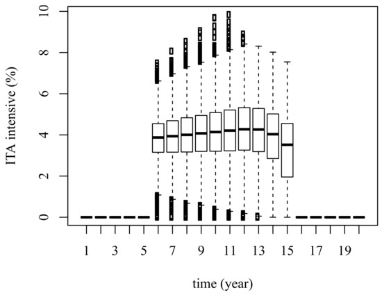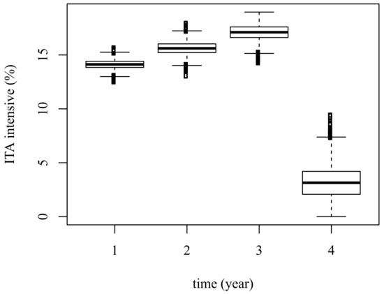 Figure 12 summarizes the uncertain application of the “intensive” ITA scheme price given electricity price uncertainty scenarios. In every scenario, years; however, the amount the GENCO can deduct as ITA is variable. Note that in year , ITA cannot be necessarily at its upper bound. Rather, it is chosen to complete the 50% issued by the Colombian regulation. In this case, total GENCO’s taxable income becomes , which permits to relax the ITA constraint by increasing its annual upper bound shown in Equation (3). ITA gradually increases during the first three years from 14.1% to 17.1% in average; then at , it reduces to 3.1% in average with the purpose of taking advantage of the total 50% offered by the government.