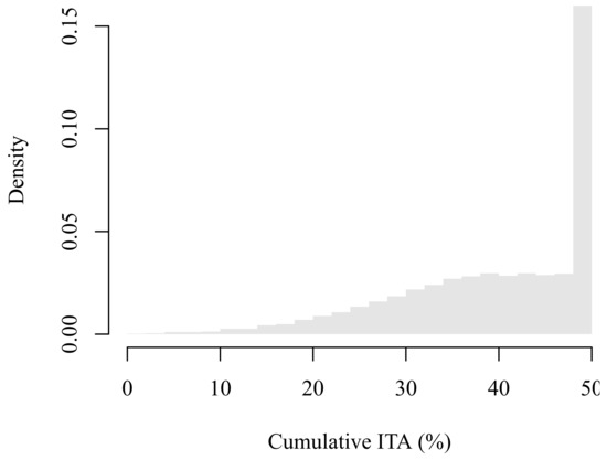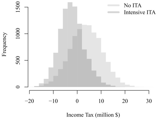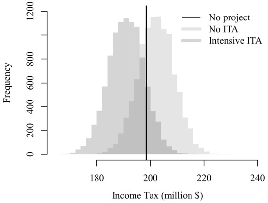 As expected, when ITA is applied, average value increases from −$2.55 million to $3.45 million. That is, ITA adds value in average to this type of solar projects. Standard deviation increases from $13.59 million to $15.10 million once ITA is implemented given the additional uncertainty added by such a tax deduction. In probabilistic terms, the probability of having negative value decreases from 57.1% to 40.7%. Although project’s value distribution has shifted towards positive numbers, this kind developers can still represent a risky investment for either new or small companies. Additionally, according to the highly likely situation of obtaining negative income tax, as illustrated in Figure 8, part of present value represents tax losses.