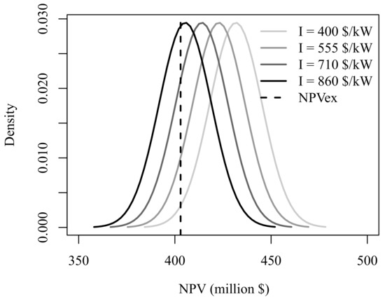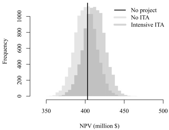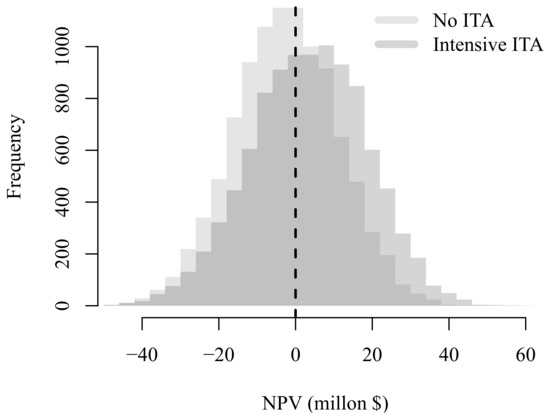 Finally, the value of the project is also affected by price uncertainty. Figure 9 displays the distributions of under absence and presence of ITA. Project’s value is normally distributed with known parameters when ITA is not considered. These parameters are carefully described in Appendix B. But, when the uncertain intensive ITA is applied as defined in Section 5.2.1, it adds additional randomness according to (7) to the cash stream and thus no longer follows a normal distribution.