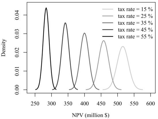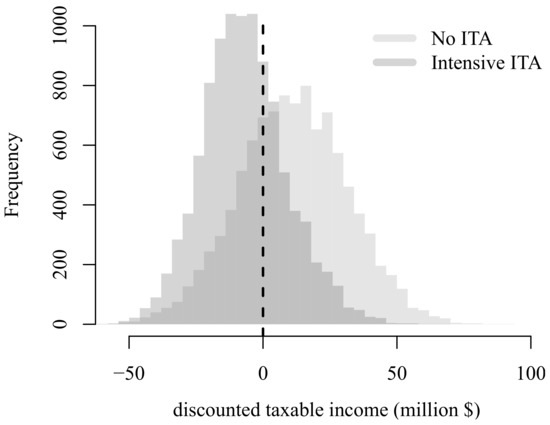 In this analysis, is also a random variable given electricity price uncertainty. Also, discounted taxable income strongly depends on initial investment cost I and depreciation plan as suggested by Equation (11). Figure 10 represents the distribution of , i.e., the negative of the random sensitivity of with respect to tax rate for the project. According to this work, discounted taxable income decreases from $11.33 million to −$6.84 million in average once ITA is implemented. Therefore, if real price ends up close to its expected value, this project would benefit anytime government decides to increase tax rate. But, in this experiment, increases from 29.02% to 69.14% when ITA is actually applied. It is surprisingly likely this project ends up collecting tax losses and taking advantage from possible government tax policies that tend to increase tax rates.