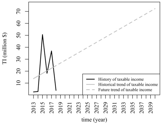 Formulation presented in Section 2.1 presumes a GENCO that owns a portfolio of existing generation projects, which will in turn continue providing an additional taxable income labeled as . In order to perform an accurate analysis, was extracted from Urrá’s financial statements, which includes before-tax and after-tax profit data, among others. Interested readers in Urrá’s financial details can refer to [63,64]. Figure 11 illustrates historical Urrá’s taxable income and its trend from 2013 to 2018. Its high variability is mainly associated with energy transactions in the power market at variable prices. The trend, in 2020 dollars, is employed to estimate the stream of .