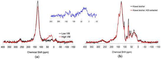 13C cross polarization magic angle spinning (CPMAS) NMR spectra of (a) high volatile matter (VM) (23%) and low VM (7%) corncob biochar and (b) 13C CPMAS NMR spectra of high VM (23%) kiawe charcoal before and after a water-extraction. Spectra are scaled to equal quantities of carbon so that peak intensities may be compared directly. The blue spectrum (inset) represents the VM, obtained by mathematical subtraction.