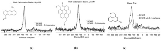 Quantitative 13C NMR (nuclear magnetic resonance) spectra. Proposed structure of average molecular repeating units for the (a) high VM corncob, (b) low VM corncob biochar, and (c) high VM kiawe biochar.