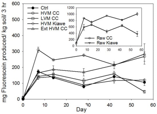 The effects of time, biochar type, nitrogen, and biochar type by time and nitrogen by time interactions were analyzed using Proc Mixed repeated measures with unstructured model (SAS 9.1). Both overall effects and effects by time were analyzed. A nonlinear regression was used to model the release of fluorescein, with and without N, using the Gompertz–Lay equation [44]. In the third experiment, the data for fungal counts and FDA activity met the assumptions of normality and homoscedasticity and were analyzed with analysis of variance (ANOVA). In case of significant effects, multiple mean comparisons were done using Fisher’s least significant difference (LSD). All analyses were performed using SAS 9.2 software (raw data used in all analyses are available online in the Supplementary Materials file). Regression analysis was performed on the fluorescein production and the fungal colony forming units using Sigma Plot 10.0.