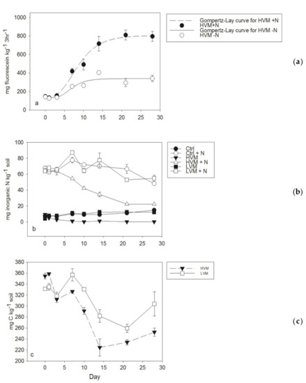 (a) Fluorescein diacetate (FDA) hydrolytic enzyme activity during a second one-month incubation of Leilehua soils with additions of different corncob biochar, with and without nitrogen (N) fertilization, fitted Gompertz–Lay equation to FDA hydrolytic enzyme activities (b) fluctuations in soil nitrate upon the additions of biochar, with and without nitrogen (N), in time and (c) water extractable organic carbon upon the additions of high volatile matter (HVM) vs. low volatile matter (LVM)corncob biochar volatile matter. Ctrl = no biochar control; HVM = 34% volatile matter corncob biochar; and LVM = 7% volatile matter corncob biochar.
