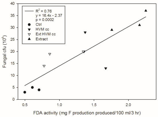 The relationship between fungal counts and FDA (fluorescein diacetate hydrolysis) hydrolytic enzyme activity in third incubation. Ctrl = no biochar control; HVM cc = non-extracted 23% volatile matter corncob biochar; Ext = acetone extracted biochar; Extract = acetone extract.