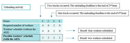 Further, assume it is measured that four workers can unload the truck in one hour. If the workday is divided into one-hour intervals, then a truck checked in for unloading creates the job that requires four workers to work for one hour. As the unloading has to be finished in three hours, all four workers can be scheduled to unload the truck in the first, in the second, or the third hour after the truck is checked in. However, the truck can also be unloaded by one worker over all three hours and by another worker during one of these three hours, and so on. Therefore, there are many combinations to schedule the execution of activities (i.e., to fulfill requirements for workers of activities that have a deadline for finishing). The idea of using the AES for decreasing the cost of the workforce in DW is represented by the example in Figure 1.