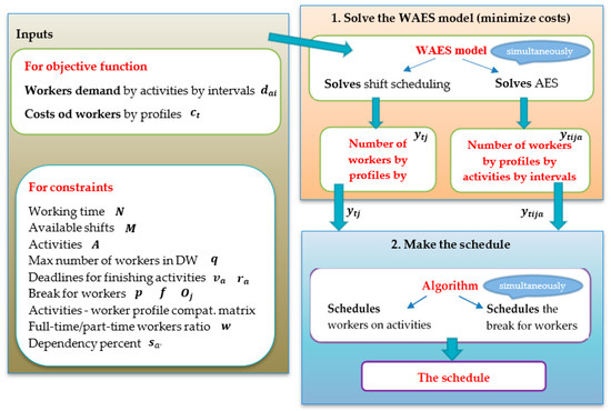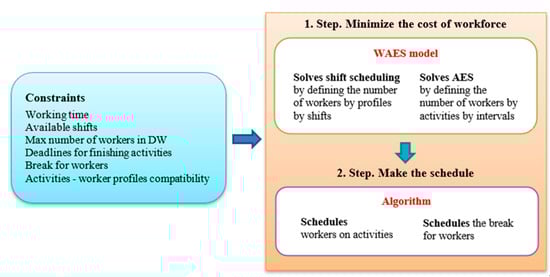 Based on the introduced issues, an entire conceptual framework for solving the problem is developed. It implies solving the WAES model first and then making the schedule for each worker. The solution of WAES provides the number of workers employed in each shift by profile, and the number of workers assigned to each activity in each interval by profile. However, the solution does not specify personally for each worker which activity he performs in which interval and when he has a break. For that need, an algorithm is developed in Python. Based on the obtained solution, the algorithm for each worker assigns an activity or a break in each interval of his shift. The entire conceptual framework for solving the problem is presented in Figure 2.