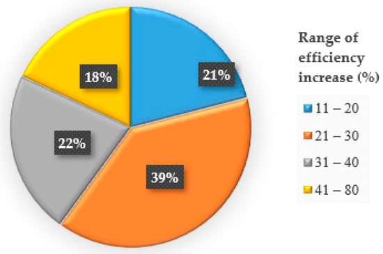 If we consider efficiency as the ratio of realized costs to costs that are theoretically sufficient to perform a given workload, then changes in the efficiency of the workforce can also be calculated to examine the effects of solving the problem as the WAES model (i.e., performing workforce scheduling together with the AES). For an activity, the theoretical lowest costs can be calculated by multiplying the hours required to perform the activity with the cost per hour of the cheapest profile of a worker who can perform the activity. By using theoretical costs of activities, the overall theoretical costs are obtained. For the real example of DW-WSP, the overall theoretical costs are 18.24. The efficiency of the workforce in the case of using the WS model for solving the problem is 79%, whereas in the case of using the WAES model, it is 87%. Therefore the efficiency is increased by 9%. The increases in efficiency for the randomly generated instances of the same problem are presented in the next figure (Figure 5).