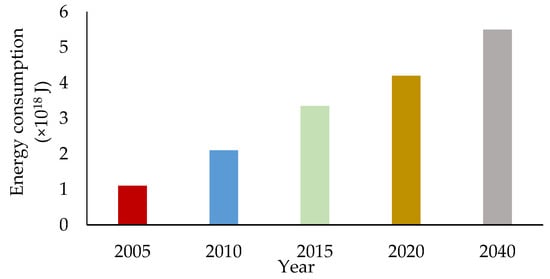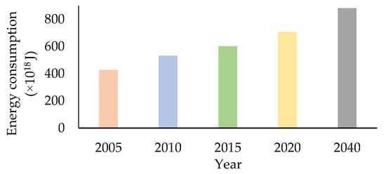 Global energy demand is increasing drastically with industrial development and human civilization [1,2,3]. As a consequence, consumption of world energy is increasing with a high growth rate of population and the industrial revolution, as shown in Figure 1.