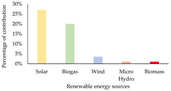 Therefore, Bangladesh has a huge potentiality for biomass energy sources. Gasification can be used to generate power from biomass effectively and cleanly. The biomass gasification process can even be coupled with cogeneration units to generate electricity [17,18]. Biomass gasification can reduce global pollution, as well as mitigate the anxiety due to decreasing reserves of fossil fuels. Biomass contains cellulose, hemicellulose, and lignin that contribute to generate energy. Currently, renewable energy sources contribute to about 35% of the total energy required in developing countries. The major contributors to renewable energy sources are solar energy, hydroelectric energy, and wind energy. However, biomass and micro-hydro system contributes a small amount of energy for the national economy due to lack of proper utilization methods (Figure 4). Therefore, the current approach of biomass gasification would be a feasible solution of power generation from biomass.
