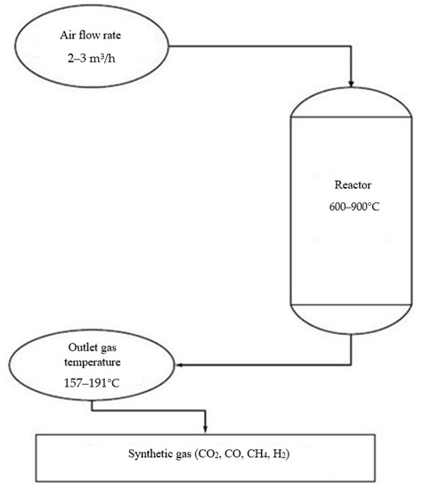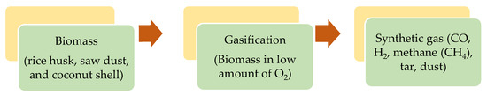 Gasification is the process where carbonaceous materials, such as biomass and coal, are converted to synthetic gas. In this process, organic solid/liquid compounds are converted to gas and solid phase. It is a thermochemical process where feedstock carbonaceous material is required to be heated up to a higher temperature [32]. The generated solid phase is known as char (carbon and ash) and the gas phase is called synthetic gas. Synthetic gas has the capacity to produce electricity and biofuel by its high heating power. Synthetic gas mainly consists of a mixture of CO, CO2, H2, CH4, and tar. Figure 5 shows the flow diagram of the gasification process of rice husk, sawdust, and coconut shell that was used to generate power in the form of synthetic gas.