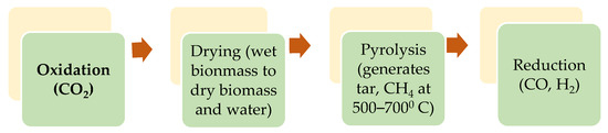 The main reactions of the biomass gasification process are endothermic. The required amount of energy is generated from the oxidation of the biomasses through a thermal process. The principal steps of the biomass gasification method are oxidation (exothermic), drying (endothermic), pyrolysis (endothermic), and reduction (endothermic) as shown in Figure 6. However, the generated tar is needed to decompose to produce light hydrocarbons (HC) [33].