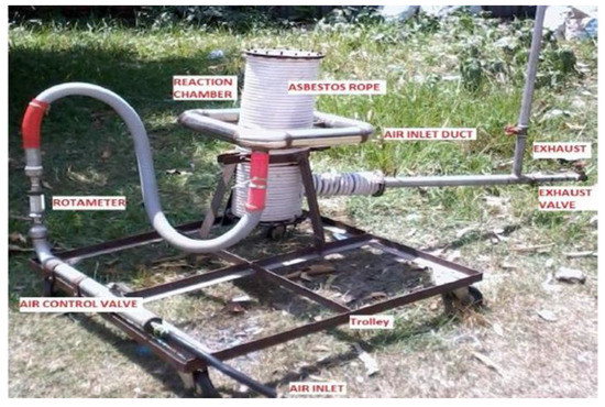In this work, a fixed-bed downdraft gasifier was used to conduct gasification as shown in Figure 8. Different parts were assembled together to carry out the experiment. The reactor was placed on a portable frame to make it easy to conduct the experiment anywhere in front of the fluid mechanics lab of Rajshahi University of Engineering & Technology, Bangladesh. The throat section was welded with the grate and bolted inside with the reactor collar to operate the gasifier easily and effectively. Asbestos ropes were wired outside the reactor to improve the insulation of the reactor.