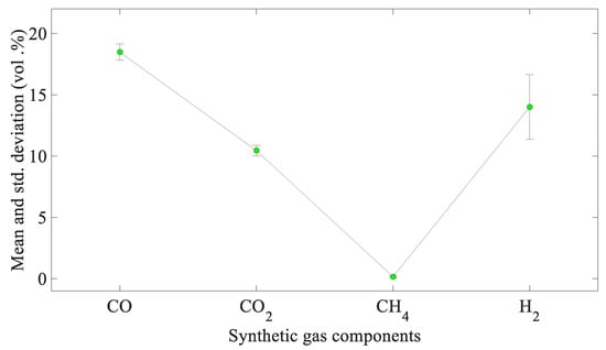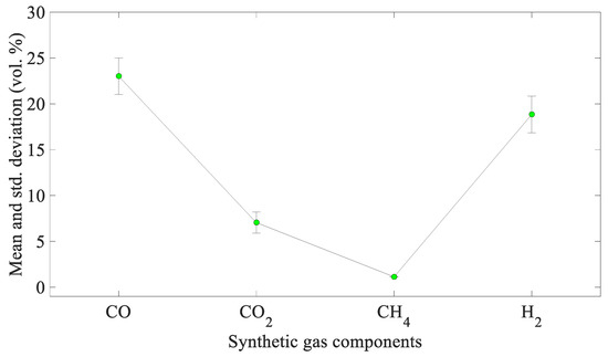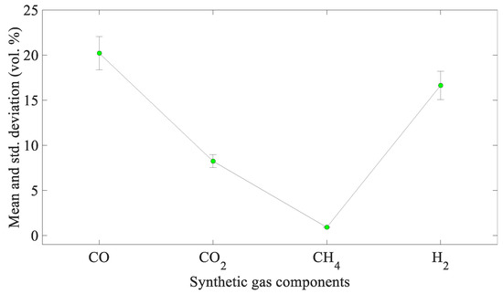 Mean and standard deviation of synthetic gas composition (vol.%) during sawdust gasification.