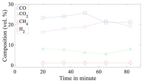 Figure 16 shows the composition of synthetic gas generated from the gasification of coconut shell using air as a gasification agent. The average concentrations of CO, CO2, CH4, and H2 in the produced synthetic gas were 23.018, 7048, 1132, and 18.846 vol.%, respectively. The concentrations of produced H2 and CH4 are higher compared to the gasification of rice husk and sawdust, although the produced CO2 concentration is lower compared to the gasification of rice husk. These trends were statistically significant. The mean and standard deviation of synthetic gas components for coconut shell gasification are shown in Figure 17. Coconut shell has higher volatile matter, carbon, and hydrogen contents, and energy density compared to rice husk. Therefore, the composition of synthetic gas in the gasification of coconut shells is better than rice husk. In addition, the produced CO is comparatively higher for coconut shell than that generated by the gasification of rice husk and sawdust. Table 6 presents the main components of the generated synthetic gas, lower heating value (LHV), and cold gas efficiency for rice husk, sawdust, and coconut shell. In the generated synthetic gas, the remaining percentage (average: rice husk 56.9%, sawdust 53.9%, and coconut shell 49.9%) of gases contains mainly nitrogen (N2).