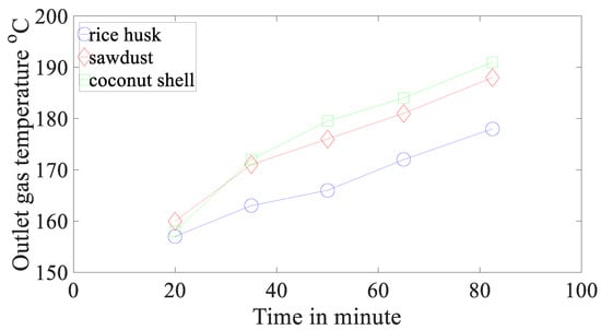Figure 18 shows the outlet gas temperature of the gasification of rice husk, sawdust, and coconut shell. In this study, the maximum and minimum outlet gas temperatures of rice husk gasification were 178 and 157 °C, respectively. In contrast, the maximum and minimum temperature of outlet gas of sawdust was found at 188 and 160 °C, respectively. On the other hand, in the case of coconut shells, the maximum and minimum temperatures of outlet gas were 191 and 158 °C, respectively. It is shown in Figure 18 that the outlet gas temperature increases with the time of gasification. On the other hand, the outlet gas temperature of sawdust gasification was higher than one of rice husk, while coconut shell showed the highest outlet gas temperature.