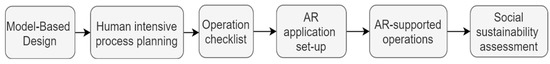 AR was established as one of the nine pillars of industry 4.0, dealing with the display of digital contents in the real-world through a device, such as a mobile phone, tablet, or special eyeglasses [6]. There is a lot of different uses for AR in the manufacturing industry, i.e., training (e.g., AR helps to become familiar with protocols, equipment, and procedures on the plant floor, dedicated training to prevent safety instances) real-time process monitoring (e.g., AR overlays text or other digital information to help people understanding what is happening on the floor without requiring additional resources or production stops), logistics (e.g., AR helps shift from manual checks for orders or shipments to automated check, which reduces errors and saves time, money, and resources), and maintenance (e.g., AR provides ad-hoc digital information about equipment and procedures to support preventative maintenance schedules, potential maintenance issues, and maintenance service history of a certain machine). A large part of AR research focuses on introducing AR technologies in industry [7] or the application to specific processes such as maintenance, assembly, and inspection [8,9,10]. Some studies also deepened the impact of AR applications on the industry, focusing on process performance [11]. However, a precise methodology to evaluate how AR technologies can benefit sustainability is still missing. While the AR impact on environmental and economic sustainability can be easily inferred (e.g., reduced paper documents, reduced travels for onsite installation, and training thanks to remote assistance), the impact on social sustainability is usually unexplored, and on the contrary, is of huge importance. Social sustainability in production sites considers the quality of working activity, workers’ empowerment, individual/collective learning, employee participation, and work-life balance. All these concepts aim to preserve or build up human capital and represent a conscious way to deal with human resources [12]. In this sense, AR can positively affect social sustainability in reducing time spent for operations, making worker conditions safer, improving workers’ wellbeing and motivation, building up user skills and raising global job satisfaction.