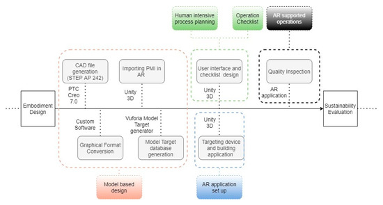 The concept of AR was first introduced by Azuma who defined this technology as a system “…that supplements the real world with virtual (computer-generated) objects that appear to coexist in the same space as the real world” [13]. This general definition needs to be translated into three main conditions: (a) something which is able to blend real and virtual content in a real environment; (b) something that is real time and interactive; (c) something which can register virtual content in 3D environment [14]. In a nutshell, AR introduces a new idea of ubiquitous, personalized interfaces that use accessible mobile technologies such as tablets and smartphones [15]. Among emerging technologies, AR can also bring valuable improvement in the design evaluation by enabling interactive changes of shapes of products as well as colors, textures, and user interfaces [16]. In any case, the introduction of digitized contents into the real-world workspace through AR can help workers correctly perform their tasks with improved accuracy and reduced error rate. Recent scientific studies demonstrated these outcomes on different application areas: assembly [17,18], disassembly [19], maintenance [20], and training [21]. On the maintenance side, Siew et al. [22] highlighted how AR can play an important role in sustainable manufacturing, acting as a reliable feedback system of monitoring and validating if maintenance operations are being correctly and timely performed. As for training purposes, Eder et al. [23] underlined how AR can improve the operators’ skill acquisition in an interactive and engaging way where instructions or machine data can be selectively displayed to address the user’s attention. With these implications, AR can support a paradigmatic shift from conventional manual labor on the factory floor to new augmented, smart processes and procedures under the industry 4.0 umbrella, promoting digital conversion of the future intelligent factories [24].