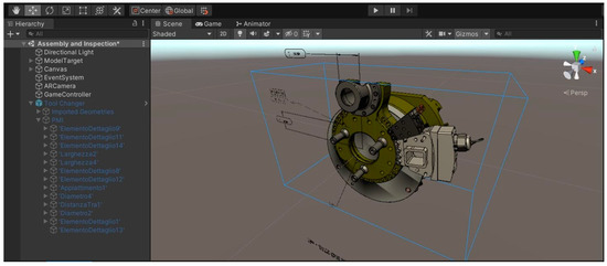 Data from the STEP files to the XML format are converted thanks to a software developed on purpose, based on standard triangulation algorithms applied to the face geometry and interpretation of the data structures used by STEP AP 242 files to represent annotations in terms of graphical and semantic content. The choice to develop an original translator was motivated by the fact that existing packages show shortcomings in terms of import of 3D annotations. More specifically, in the context of AR applications, only mesh data are usually extracted from standard file formats (such as fbx, .obj, etc.) while curve or polylines entities are not natively supported. Thus, flexibility and completeness of data can be guaranteed, as can independence from future enhancements in the managed entities. The converted geometry is imported in Unity 3D, which is a high-fidelity gaming engine used in the industrial context to develop virtual and augmented reality applications. Unity has been used as a platform to develop the AR application, define the user task list, and support the inspection operations. In order to build the 3D scene, an ad hoc plugin of Unity 3D was developed to read entities from the XML exchange file. According to Unity 3D standard procedures, the imported entities are organized in GameObjects and structured to separate solid geometries from PMIs—which are both children of the same parent GameObjects—for a flexible manipulation in the scene preparation phase, as represented in Figure 4.