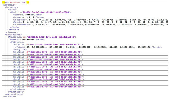 The proposed system moves from an initial definition of enriched geometric models, including manufacturing specifications and the intended procedures for the verification process aiming at reflecting the original design intent. For the purpose, PMIs have been added to the 3D geometry of the tool changer using the dedicated functionalities of the PTC Creo 7.0 CAD software. Then, the STEP AP 242 format was chosen as a readable standard format to convey both geometric and inspection data. In particular, annotations such as geometric tolerances and surface finishing have been added to guarantee a correct functional behavior of the analyzed group (i.e., the tool changer slave assembly in its coupling with its counterpart, the master group mounted on the robotic arm). Desired information, in the form of PMI, was applied on a multibody geometry representation of the assembly (i.e., the geometry represented by multiple solid bodies in a single part file). Such an unusual choice was driven by the lack of implemented STEP AP 242 export functionalities for assembly models, as emerged from a benchmark on various commercial mechanical CAD software. In fact, current releases of CADs limit a correct export of PMI definitions in STEP AP 242 files only for part models, even if including more separate solid models. In STEP files, solid bodies are represented by storing both the analytical geometry and the topology of the solid definition according to the specific boundary representation (BRep) solid scheme. However, from this representation scheme, graphical data in the form of polylines and meshes need to be extracted, which are more usable in the context of AR applications. To this aim, we used a conversion to an intermediate XML (extensible markup language), which is a metalanguage that allowed us to define customized markup languages, especially in order to display documents on the Internet. We exchanged the provided file format in order to decouple the engineering information that is properly conveyed by STEP files from the pure graphical representation patterns, typical of AR applications. The adopted XML file schema was built to keep track of the product parts hierarchy, the geometry of the solid bodies through meshes of the contour faces, and annotations in the form of polylines or even meshes, as shown in Figure 3.
