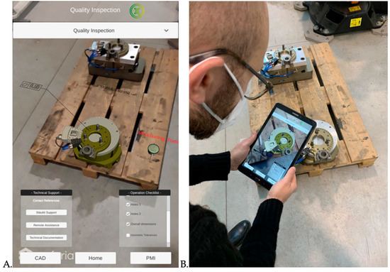 (A) Interface of the AR quality inspection application and an (B) example of users engaged in inspection operations with the handheld device.