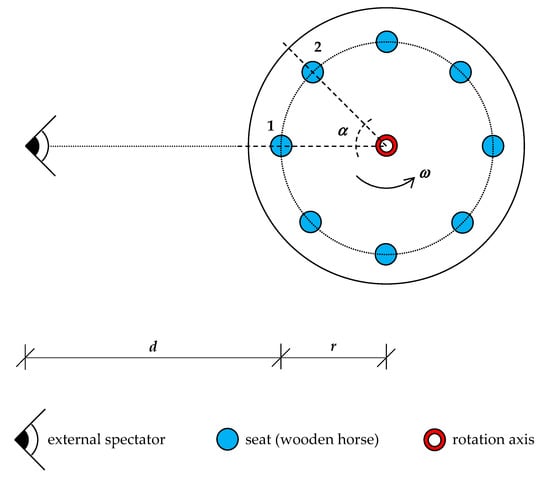 Obviously, all elements being rigidly tied to the circular platform, the above constraints (i.e., Equations (9) and (10)) are independent of the adopted motion regime. In the case of seats aligned on different rows, the above constraints have to be imposed for any row. Moreover, according to Equation (10), each row has to be considered as a circular platform for all inner rows.