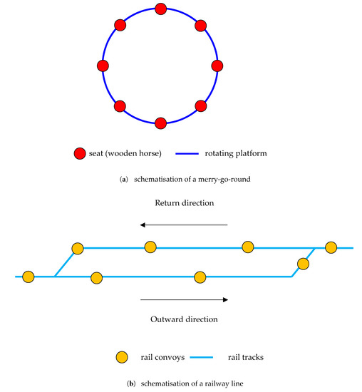 Figure 3, if we consider passengers waiting on a station platform as external spectators of a roundabout and the rail convoys as the riders (i.e., wooden horses), we may analyse a rail service by adopting the Merry-Go-Round paradigm. Obviously, it is necessary to take into account the following differences: