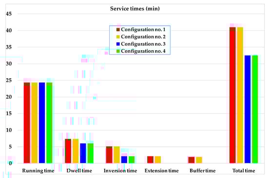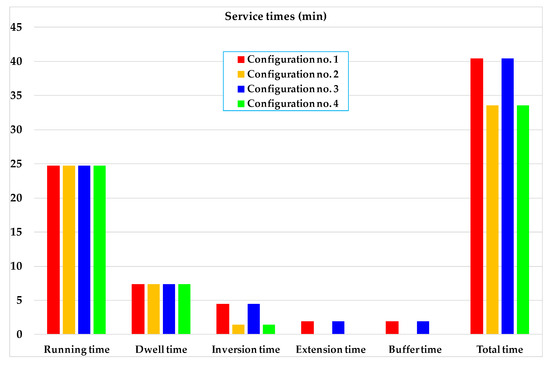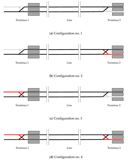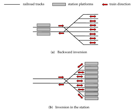 Figure 4a), the inversion time is evaluated from the platform of the last station to the end of the inversion track and from the end of the inversion track to the platform of the first station. It means that, in the case of “inversion in the station” layout, running times, which have to be computed up to the switching point, may be greater, while inversion times may be smaller with respect to the “backward inversion” configuration.