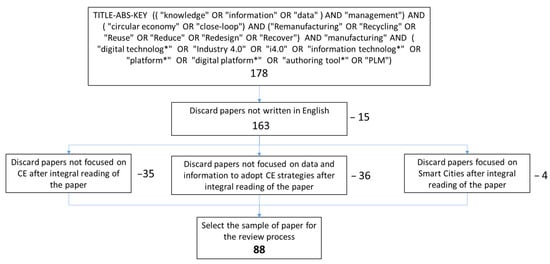 “Scopus” was used as scientific database for this review, being it the most diffused one for industrial engineering and having a broader coverage [33]. “Scopus” was queried using the following keywords: TITLE-ABS-KEY ((“knowledge” OR “information” OR “data”) AND “management”) AND (“circular economy” OR “close-loop”) AND (“Remanufacturing” OR “Recycling” OR “Reuse” OR “Reduce” OR “Redesign” OR “Recover”) AND “manufacturing” AND (“digital technolog*” OR “Industry 4.0” OR “i4.0” OR “information technolog*” OR “platform*” OR “digital platform*” OR “authoring tool*” OR “PLM”). These keywords were defined after a random screening process in the extant scientific literature regarding contributions dealing with data and information in CM, selecting keywords coherent with the terminology adopted in the extant scientific literature. Nevertheless, the string of keywords enabled to partially limit the panel of papers within the boundaries of the research interest, and therefore other eligibility criteria were added. Only English written documents were selected, to include the latest global studies, without any restriction on timeframe and publication sources. A screening process was performed leveraging on three main criteria to discard out-of-topic papers, thus not dealing with data and information in CM:
