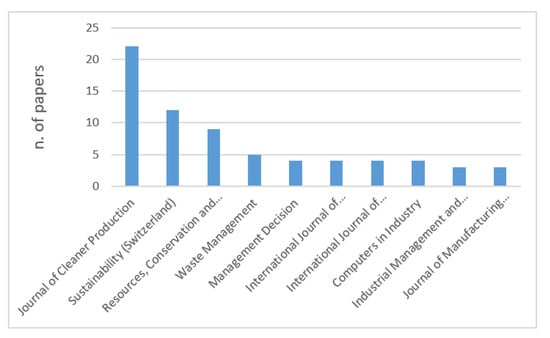 Observing the sample of selected papers, the top ten journals where these contributions have been published are reported in Figure 2. In particular, the number of publications in Journal of Cleaner Production, Sustainability (Switzerland) and Resources, Conservation and Recycling evidently overcome the rates of the others.