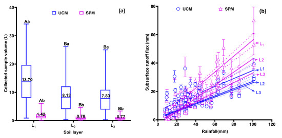 The collected sample volume (a) and the relationship between subsurface runoff (SSR) flux and rainfall (b) at each soil layer under both methods. The L1, L2, and L3 values represent the SSR flux flowing out of the corresponding soil layer, respectively. The capital letters indicate significant differences between different soil layers, and the lowercase letters indicate significant differences in the same layer between different methods at p = 0.05. The solid line is the best-fit line of simple linear regression, and the dotted lines are the 95% confidence bands. The values in the box plots are the medians.