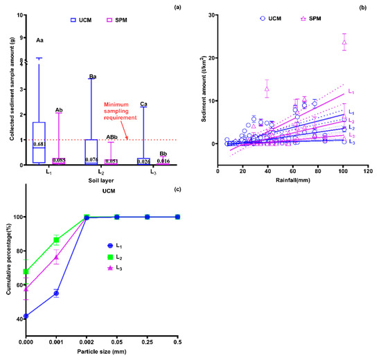 Figure 3 existed that the difference in sediment migrations under both methods was significant. In Figure 3a, during the test period, the average collected sediment amounts per rainfall event at the L1, L2, and L3 layers under UCM were 6.22, 3.61, 4.97 times those under SPM. The deeper the soil layer, the lower the sediment amount collected. The sediment collected by the SPM was basically less than the minimum sampling requirement of 1.0 g under a single rainfall–runoff event. Figure 3b indicates that each soil layer’s migrated sediment load presented a significantly positively linear correlation with rainfall under both methods. However, when the rainfall was higher than 20 mm, the migrated sediment loads from the SPM at each soil layer were higher and more substantially affected by rainfall. With increased rainfall, the sediment migration amounts at each soil layer increased obviously. The topsoil layer was more obviously affected by rainfall than the two lower layers. Figure 3c indicates that the sediment particle size distribution (PSD) was significantly different in each soil layer. The fine particle with a size less than 0.05 mm dominated the sediment at each soil layer. The cumulative weight percentage of sediment particles below 0.002 mm at L1 was 55.09%, while 86.40% at L2, and 76.48% at L3. Remarkably, the particles’ size at L1 was more extensive than that at other layers, and the L2 layer had the smallest sediment particle.