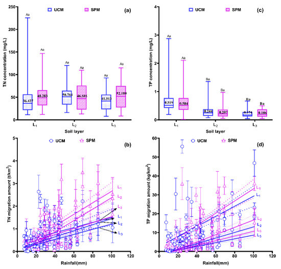 Figure 4 indicated that the difference in nutrient migrations under both methods was not significant. Figure 4a showed that there were no significant differences in TN concentrations between the three soil layers. The average TN concentration under the UCM was 47.43 mg/L at L1, 51.83 mg/L at L2, and 43.28 mg/L at L3, while 50.31 mg/L, 34.83 mg/L, and 51.23 mg/L under the SPM, respectively. Figure 4b indicated that the TN migration amount at each soil layer presented a significantly positively linear correlation with rainfall under the UCM and SPM. However, the TN concentrations from the SPM under the same rainfall event at each soil layer were higher than those from the UCM. In other words, the SPM was more substantially affected by rainfall than the UCM. Figure 4c shows no significant differences in TP concentrations between the L2 and L3 layers, except in the topsoil layer (L1). The average TP concentration under the UCM was 0.71 mg/L at L1, 0.30 mg/L at L2, and 0.22 mg/L at L3, while 0.59 mg/L, 0.29 mg/L, and 0.22 mg/L under the SPM, respectively. Figure 4d indicated that the TP migration amount at each soil layer presented a significantly positively linear correlation with natural rainfall under both ways. However, the TP concentrations from the SPM under the same rainfall event at each soil layer were higher, but not significantly, than those from the UCM.