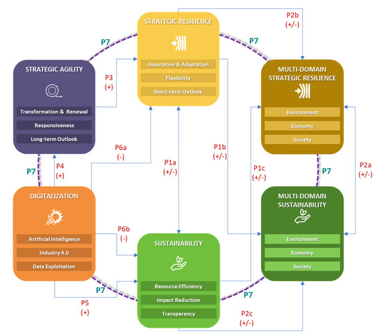 As it is possible to notice from the table, seven propositions have been formulated. The first one (P1) highlights the interdependence of the concepts of sustainability and resilience by pointing out that the effects of one on the other, and vice versa, can be both positive and negative. The second proposition (P2) calls for a multi-domain view of resilience, just as is the case for sustainability (environment, economy and society), to better capture the interdependencies between the two concepts. The third proposition (P3) states that agility represents the strategic dimension of resilience, that is, the responsiveness of an organization to change. The fourth proposition (P4) points to digitization as an enabler for agility because technologies speed up processes by making the organization more flexible, efficient and effective. The fifth proposition (P5) notes that digitization, by promoting more efficient use of resources, has a positive impact on sustainability. The sixth preposition (P6), on the other hand, emphasizes that digitization, by triggering change can also exert a negative rebound effect on both resilience and sustainability. Finally, the seventh proposition (P7) concludes that a strategically resilient organization leverages its capabilities to deal with change, while also strengthening them.