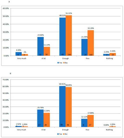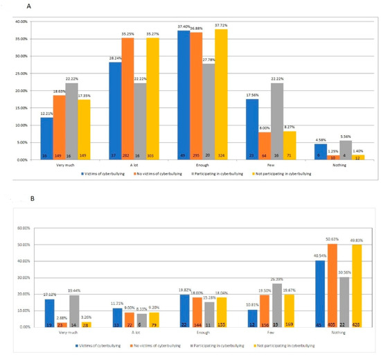 The importance of the physical aspect, especially during adolescence, makes some at this age potential victims of cyberbullying [27]. The students who stated that they were critical of their physical appearance were more sensitive and therefore more vulnerable (and subjected) to cyberbullying actions. In the collective imagination, victims have low self-esteem, while the perpetrators have high self-esteem that they tend to inflate by bullying the weakest. However, the data that resulted from this study did not seem to confirm this popular belief. As shown in Figure 1B, the number of students stating to be satisfied with their appearance was higher among victims than among perpetrators. The y-axis of the graph indicates the students’ experience (victim/participation) of cyberbullying, while the x-axis shows the level of satisfaction with their appearance. The graphs illustrate both the percentage and the number of students (at the bottom of the graphs). The students’ satisfaction with their school performance represents (as mentioned above) another important factor; it indicates the value that students attribute to themselves. It is not a simple self-evaluation of the student’s school abilities and successes, but the extent to which each student perceives that they are good enough. It was observed that children who were neither victims of cyberbullying nor perpetrators reported that they were very satisfied with their school performance (see Figure 2A).