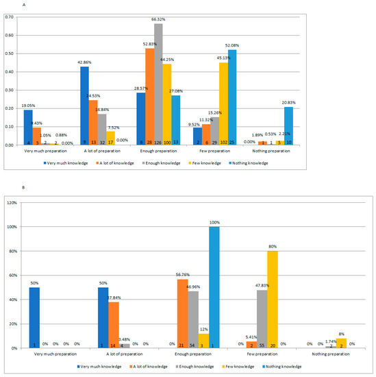 Another important aspect is represented by the positive relationship between the knowledge of the phenomenon and the ability to manage it. Data show that the greater the parents’ knowledge of cyberbullying, the greater their ability is to manage it (see Figure 4A). Compared to parents, teachers are more familiar with the phenomenon; 24% of the teachers know it very well, and 60% knew enough. The ability to face the problem for 13% of the teachers is similar to that highlighted by the parents, and as for the parents, an increase in knowledge about the phenomenon by teachers leads to an increase in the ability to manage it (see Figure 4B). The y-axes of the following graphs indicate parents/teachers’ perception of their ability to manage cyberbullying, while the x-axes indicate their knowledge of it.