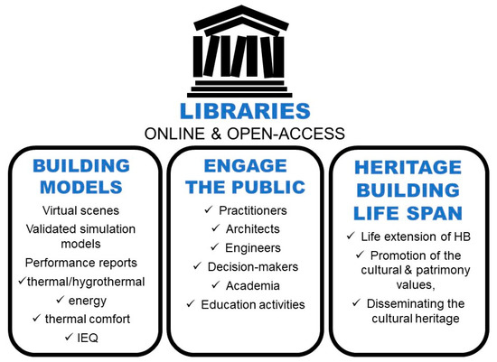Additionally, the methodologies developed for specific case studies can be extrapolated more easily to other cases. These libraries should consider the following features: (i) they should provide detailed building models with virtual scenes, validated simulation models, performance reports on several evaluation dimensions (e.g., thermal/hygrothermal performance of the envelope, energy performance of the systems, thermal comfort parameters, IEQ, etc.); (ii) they should engage the general public, practitioners, architects, engineers, decision-makers and academia—as the higher-education sector holds important functions in educating the next generation of professionals for a sustainable culture [22]—and provide education activities; (iii) they should contribute to the life extension of HBs and the promotion of their cultural and patrimonial values by openly disseminating their cultural heritage via online library and design strategy reports. These libraries should also comply with the UN 2030 Agenda goals as they will promote sustainable consumption of energy and resources, and they will contribute to combating the impacts of climate change. By exploring the sustainability of tourism [23] and developing an open dissemination program, these approaches also hold an inclusive and socially sustainable character.