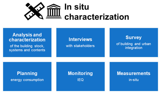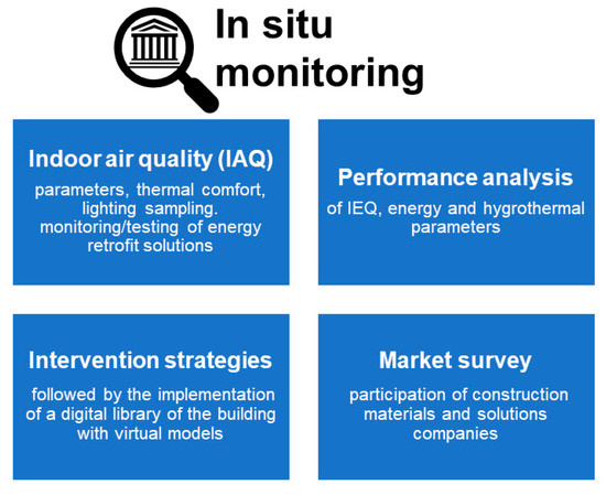 - Characterization and planning of the monitoring of the energy systems performance, activities and occupancy, including: (i) 3D laser scanning of the building and HBIM; (ii) planning in situ measurements to characterize the thermophysical properties of the building envelope and design energy retrofit solutions (U-value and hygrothermal monitoring), as suggested in various reports of European projects (see refs. [25,26]) or field studies (see ref. [27]); (iii) market survey/invitation to participation of companies/manufacturers of construction materials and solutions;