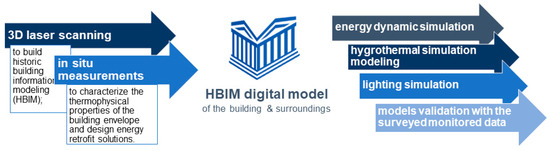 In more detail, the proposed methodology starts with a thorough analysis and characterization of the HB to gather data on the construction system, building pathologies, building geometry and surroundings, energy consumption, activities and occupancy of the building. In this phase, the virtual BIM structure with geographic survey data (collected using laser scanning and photogrammetry, as suggested in ref. [28]) can be created. This will then be used as a digital and georeferenced repository of the information collected during the survey of all existing data (e.g., mapping the sensors location, harvesting more precise and correlated data, facilitating data storage). In parallel, energy retrofitting solutions can be carefully planned, and in situ experiments can be carried out (e.g., to evaluate the thermal resistance of the building envelope, as well as to monitor the hygrothermal performance of historic elements). The performance of such solutions can be monitored through remote sensing technology designed for the hygrothermal assessment of historic walls in a conservation-compatible mode [29]. These initial steps of the methodology should be done in agreement with the most recent ‘Guidelines on energy efficiency of cultural heritage’ [30], current practices/research activities [31,32] and other codes/protocols/examples addressing this matter [33].