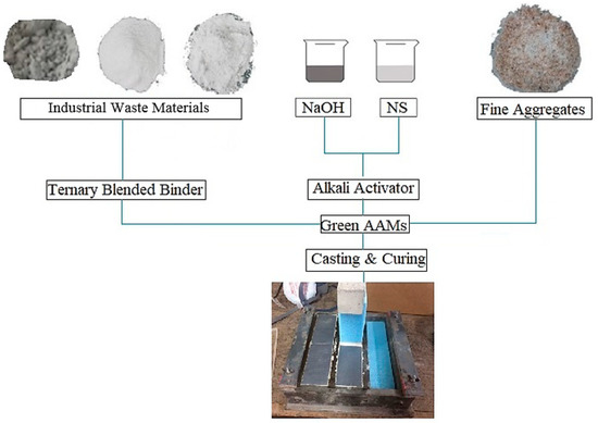 After preparing the AAMs, the experimental program discussed herein involved the casting process, where the resulting mortar was poured into the molds using the two-layers pouring method. To eliminate air pockets within the mixture, each layer was subjected to vibration for 15 s. After finishing the casting process, the AAMs were cured for 24 h in an ambient atmosphere (with a temperature 24 ± 1.5 °C and a relative humidity of 75%). Figure 1 illustrates the typical procedure to obtain AAMs with varying ratios of industrial wastes.