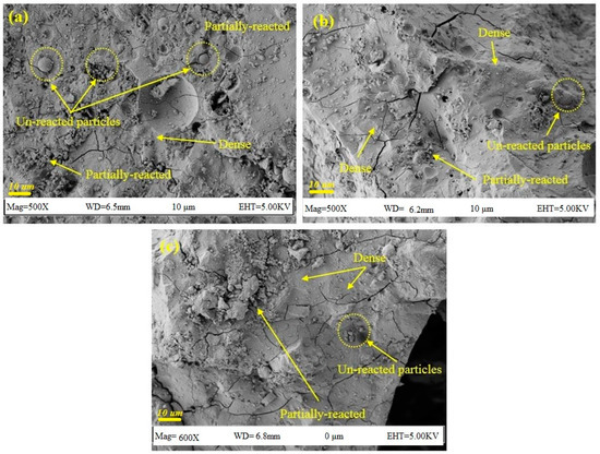 The SEM images showing the microstructure of AAMs with a high volume of FA contents are shown in Figure 2a, b and c with 50%, 60%, and 70% FA, respectively. Figure 2a reveals that the microstructure of the sample containing a high amount of FA was less dense compared to other matrices, due to a lack of C-S-H gel formation. Once the content of FA was decreased and replaced by GBFS, the microstructure of AAMs was enhanced and provided a denser surface, as shown in Figure 2b and c. The SEM images also acknowledged that in AAMs with 70% FA, the gel structure and unreacted/partially reacted particles were extensively distributed over the surface, whereas by decreasing the FA content to 60% and 50%, a dense gel dominated the surface of AAMs.