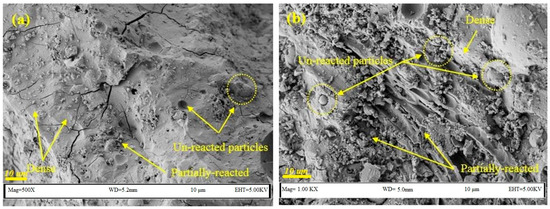 Figure 3 shows the effects of POFA replacement by GBFS on AAMs with 60% FA. The SEM image clearly indicates that the design mixes with zero POFA (60% FA and 40% GBFS) have a dense structure (Figure 3a). On the other hand, once the POFA percentage, replaced by GBFS, was increased from 0% to 20%, the dense gel phase was decreased, and the AAMs enclosed unreacted/partially reacted phase (Figure 3b). Increasing the content of POFA affected the calcium content and hence reduced the C-S-H product formation with poor microstructure. This particular issue also negatively affects the mechanical properties, where the CS decreased from 80.5 to 52.6 MPa by replacing POFA with GBFS from 0% to 20%, as shown in Table 3.