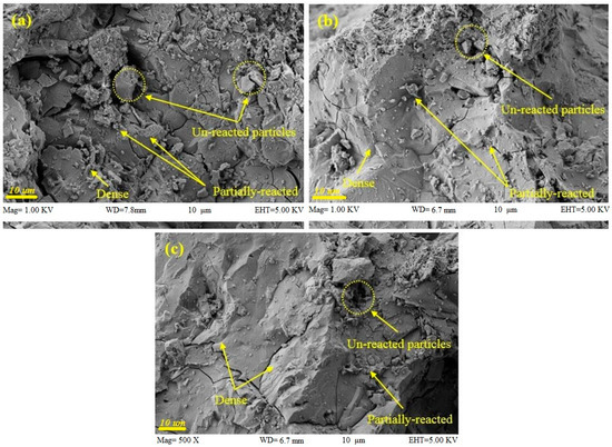Scanning electron microscopy (SEM) images of AAMs containing a high volume of fly ash (FA), with evidence of (a) 70% FA, (b) 60 % FA, (c) 50% FA.