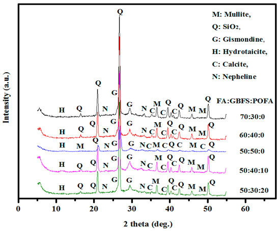 X-ray diffraction (XRD) pattern of AAMs containing a high volume of FA and POFA replaced by GBFS containing 50% FA.