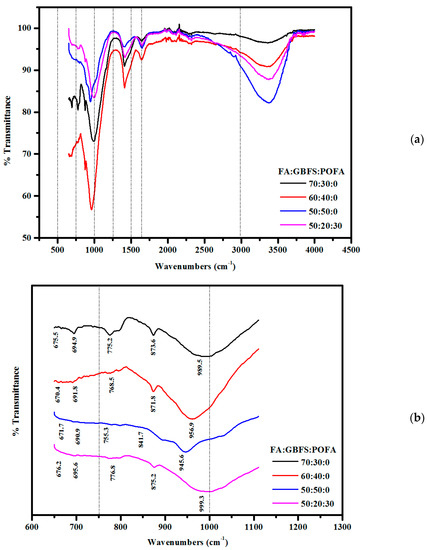 GBFS contains higher CaO than FA and POFA, leading to a high potential for Ca solubility in the mixture. The quantity of soluble Ca depends on the volume of GBFS present in the mixture, which directly affects the C-S-H gel. The unit oligomer of (Si–O–Al) Ca could be built up in chains, sheets, or a three-dimensional framework through the polycondensation process to result in the product hardening [30]. Furthermore, Davidovits described the Ca-based AAMs as the condensation resulting from the hydroxylation of the gehlenite and akermanite phase to form cyclo Ca-ortho-sialate-disiloxo (C3AS3) and Ca-disiloxonate hydrate C-S-H, respectively. Figure 6 shows the FTIR spectra and FTIR fingerprint zone of AAMs with a high volume of FA.