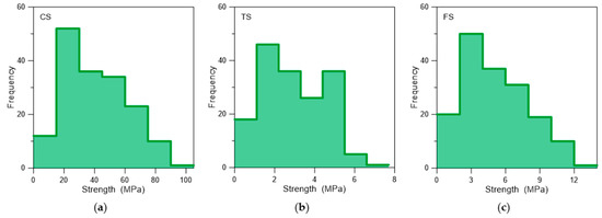 Histogram of output data for (a) compressive strength (CS), (b) tensile strength (TS), and (c) flexural strength (FS) parameters.