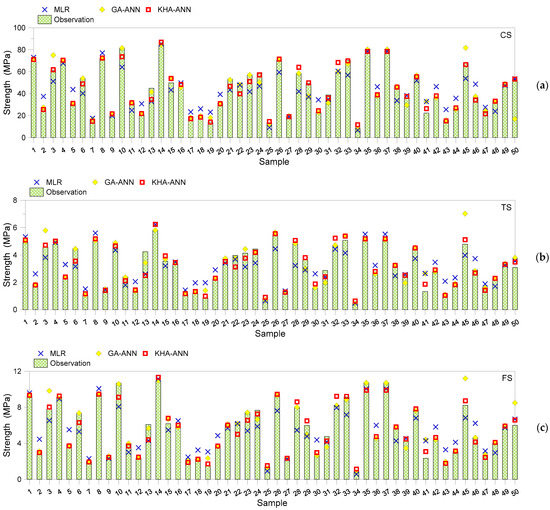 Table 11 shows the statistical results for input parameters provided by all three investigated models. The results of KHA-ANN, GA-ANN, and MLR models are also shown in Figure 9 for all the three output parameter of CS, TS, FS. The collected results indicate that the KHA-ANN model provides more accurate results, compared to the GA-ANN and MLR models.