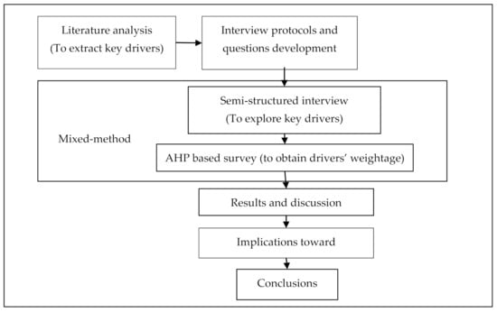 In this study, mixed-methods were employed to collect and analyze the related data. In the first stage, the qualitative method or semi-structured interview sessions were chosen. The designed interview protocols were tested with 10 researchers to ensure that the right terminology and correctly structured questions were used. Next, the interviews were conducted with selected interviewees to explore and determine the drivers to achieve material efficiency. Secondly, the AHP-based survey was conducted to strengthen the qualitative findings by determining the weight in terms of the importance of each obtained driver. The research design for this study is shown in Figure 1, below.