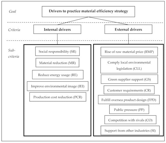 In past studies [22], two groups of drivers were commonly identified and studied, namely: (a) Internal drivers; and (b) External drivers. Internal drivers emphasize the organizational factors to encourage an organization to undertake manufacturing practices, such as increasing the company’s profits, while external drivers are defined as the external forces to motivate a manufacturing company to change or undertake appropriate practices, such as complying with environmental regulations. Both drivers are important measurements for a company to practice material efficiency. Using this classification as a foundation, the analyzed drivers were assigned to both groups, accordingly. A summary of the details of the internal and external drivers is shown in Table 1.
